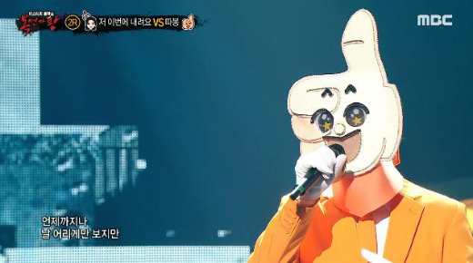 가왕 ‘5월의 에메랄드’에 도전하는 복면 가수 2라운드 솔로 대결에서 복면가수 '따봉'은 투투의 ' 대 눈물까지도 '를 선곡해 열창했다.
