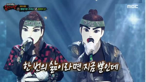 가왕 ‘빈대떡 신사’에 도전하는 복면 가수 3라운드 복면 가왕 도전자 결정전에서 복면가수 '형제의 난'은 코리아나의 ' 손에 손잡고 '를 선곡해 열창했다.