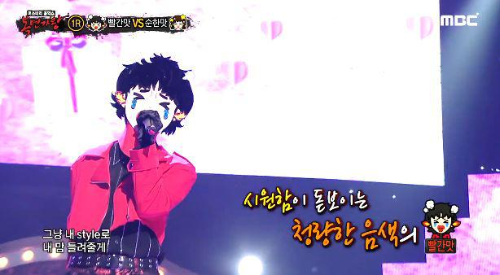 가왕 ‘빈대떡 신사’에 도전하는 복면 가수 2라운드 솔로 맞대결에서 복면가수 '빨간맛'은 휘성의 ' With Me '를 선곡해 열창했다.