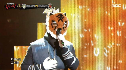 가왕 ‘빈대떡 신사’에 도전하는 복면 가수 3라운드 복면 가왕 도전자 결정전에서 복면가수 '천둥호랑이'는 박미경의 ' 기억속의 먼 그대에게 '를 선곡해 열창했다.
