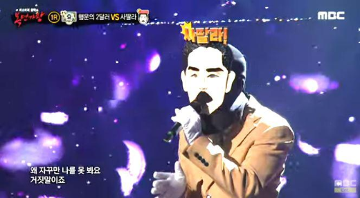 가왕 ‘겨울아이’에 도전하는 복면 가수 2라운드 솔로대결 에서 복면가수 '사딸라'는 노을의 ' 만약에 말야 '를 선곡해 열창했다.