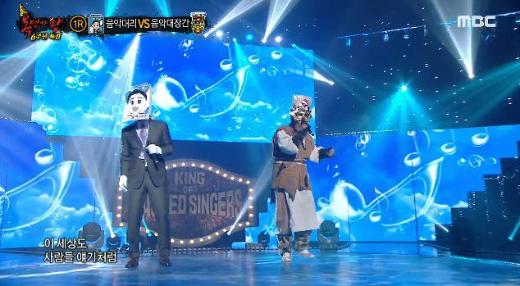 가왕 ‘아기염소’에 도전하는 복면 가수 1라운드 맞 대결에서 복면가수 '물시계'는 비비의 ' 바보 '를 선곡해 열창했다.
